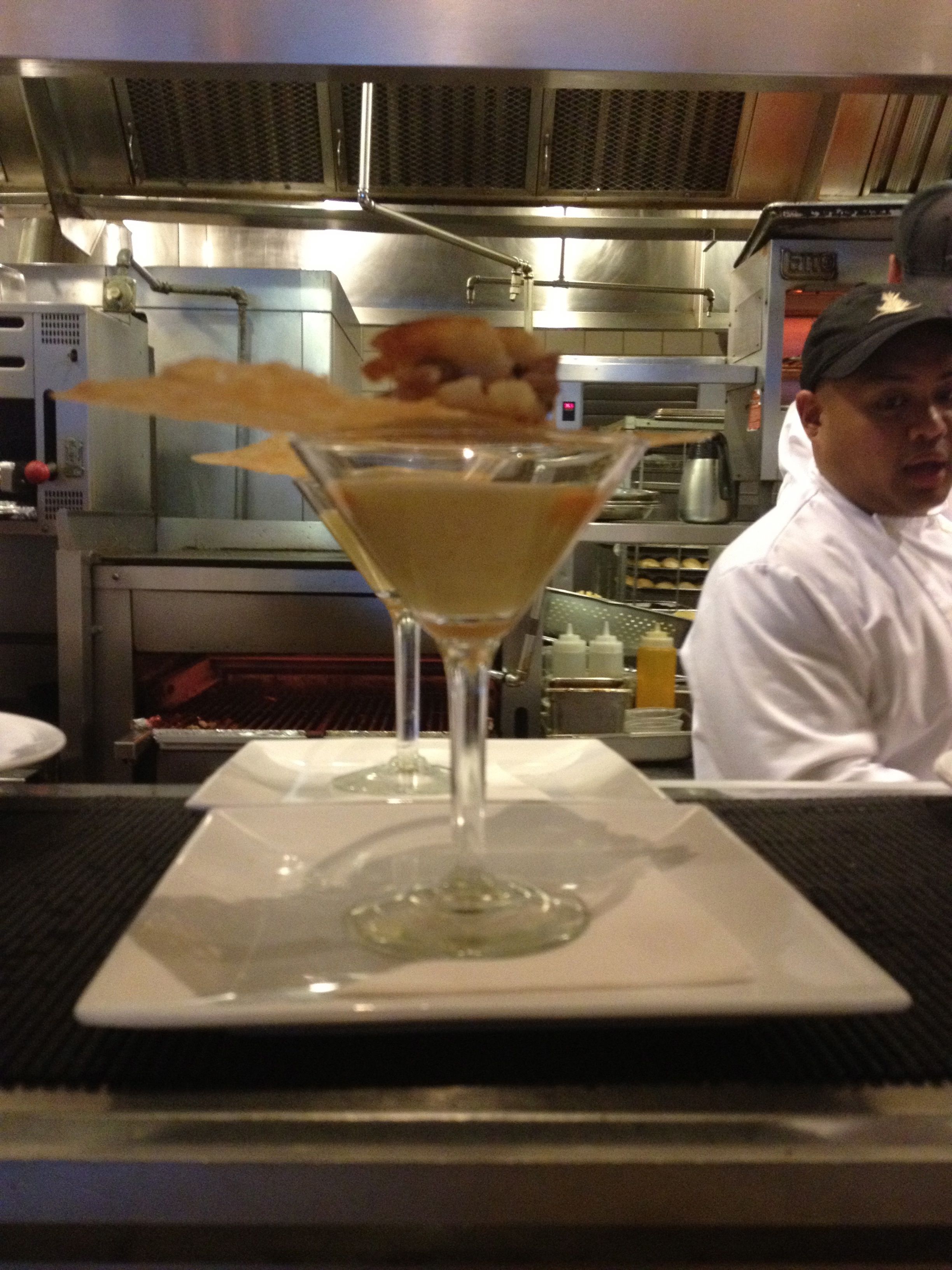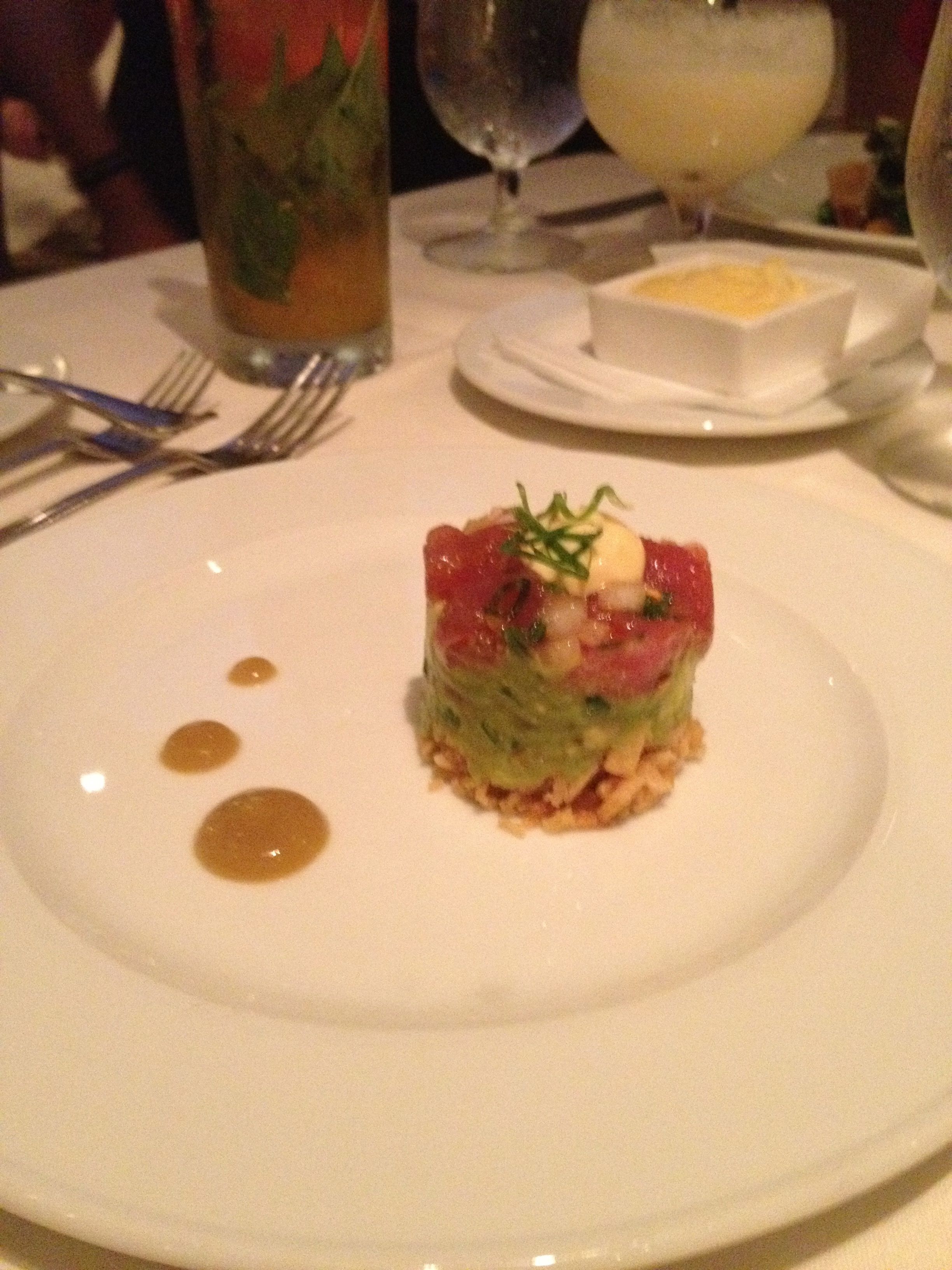 For the classic tasting menu, we started off with a “soup and sandwich” consisting of a chilled tomato soup with a grilled cheese-and-kalua-pig sandwich. It was amazing! This was followed by an ahi sashimi and avocado salsa stack, which is also an appetizer on the main menu. Yummy!